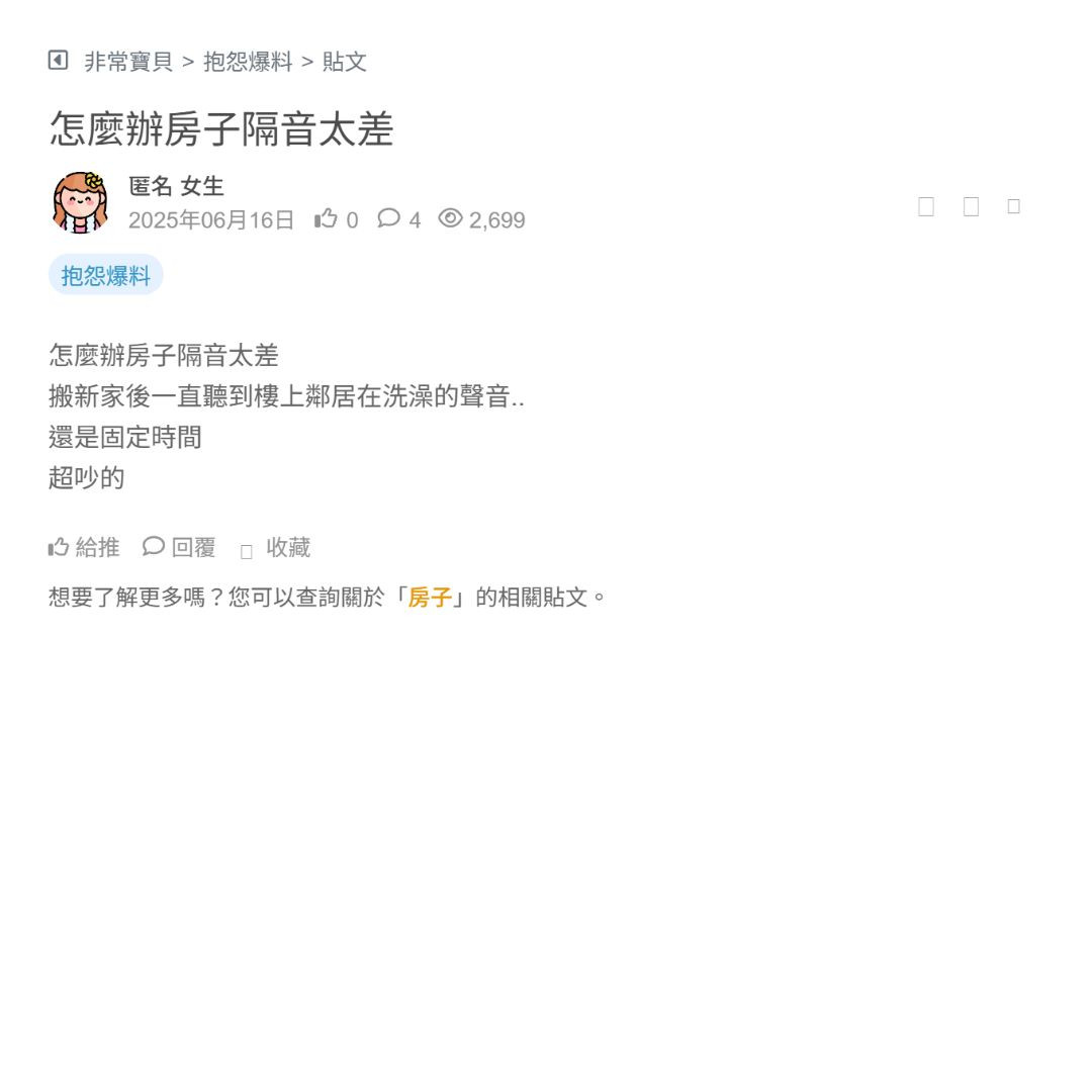 我們家有2個月的新生兒 不知道樓上是不是最近有換租客 半夜常常聽到他們的洗澡聲 偏偏浴室離寶寶睡覺的地方很近 半夜寶寶一直被吵醒 但是樓上只有洗澡 我們應該...