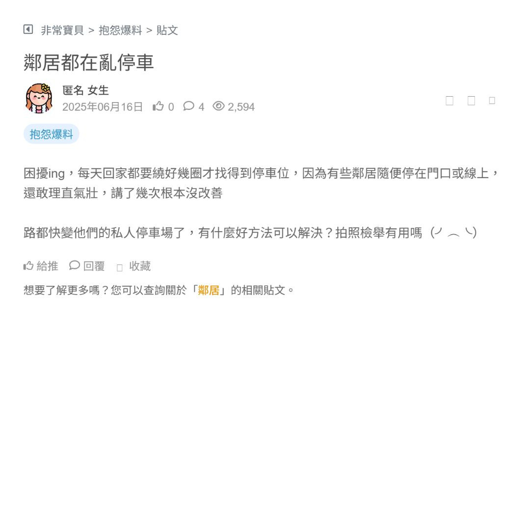 困擾ing,每天回家都要繞好幾圈才找得到停車位,因為有些鄰居隨便停在門口或線上,還敢理直氣壯,講了幾次根本沒改善