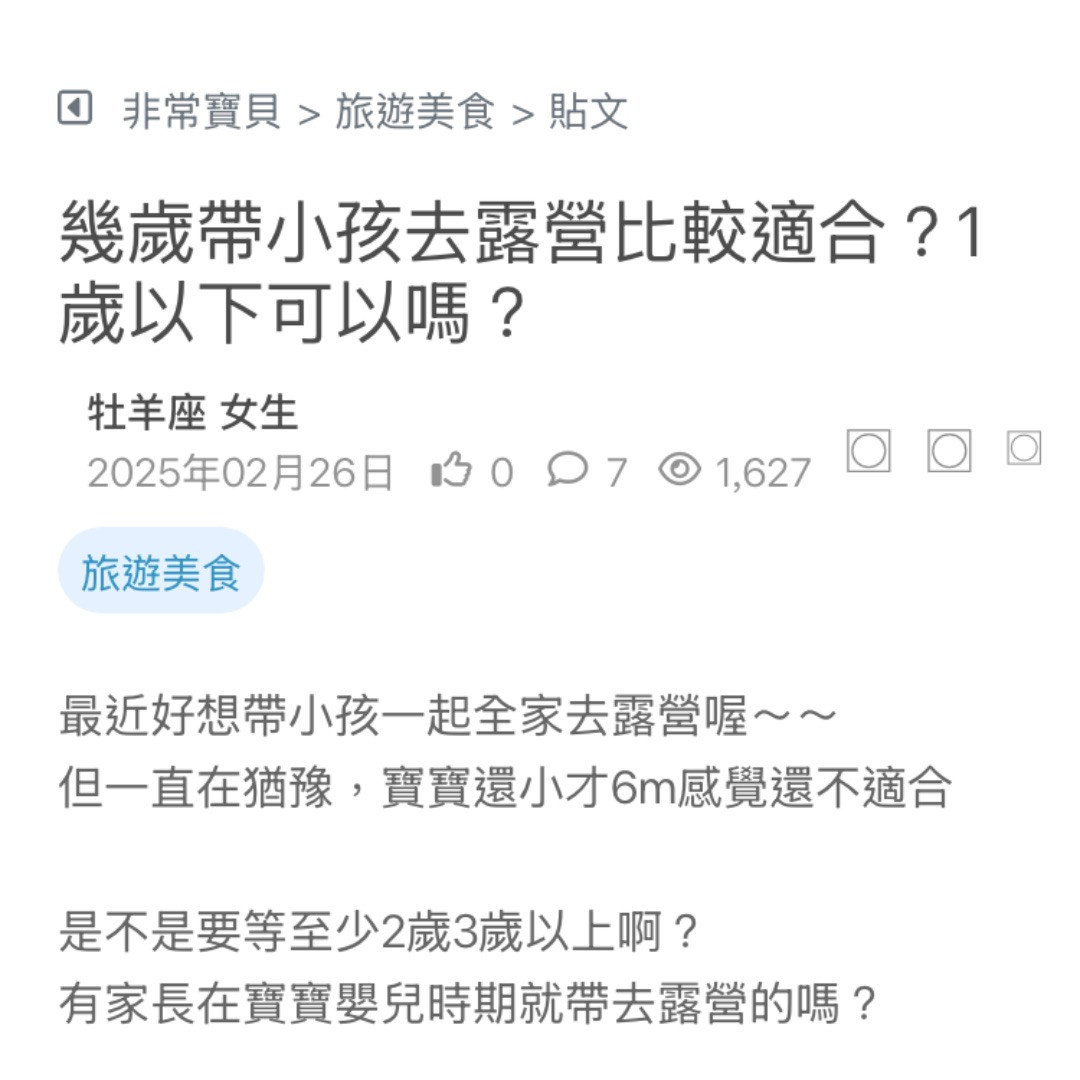 我寶寶7m時去過露營,真的超累😂 一直要顧著他,怕摔倒、怕蚊子、怕太冷,半夜還起來哭幾次⋯建議至少1歲以上比較好!
