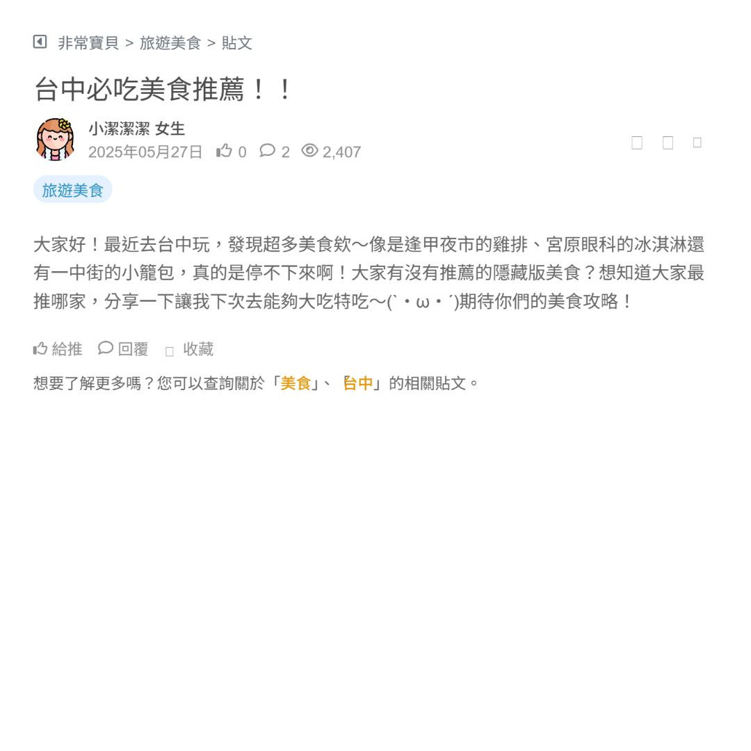 大家好!最近去台中玩,發現超多美食欸~像是逢甲夜市的雞排、宮原眼科的冰淇淋還有一中街的小籠包,真的是停不下來啊!大家有沒有推薦的隱藏版美食?想知道大家最推哪家,分享一下讓我下次去能夠大吃特吃~(`・ω・´)期待你們的美食攻略!