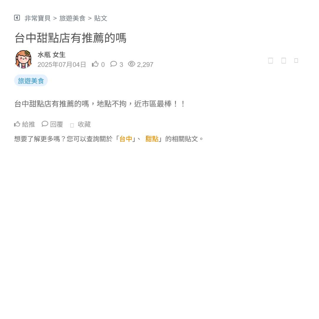 大家好!最近去台中玩,發現超多美食欸~像是逢甲夜市的雞排、宮原眼科的冰淇淋還有一中街的小籠包,真的是停不下來啊!大家有沒有推薦的隱藏版美食?想知道大家...