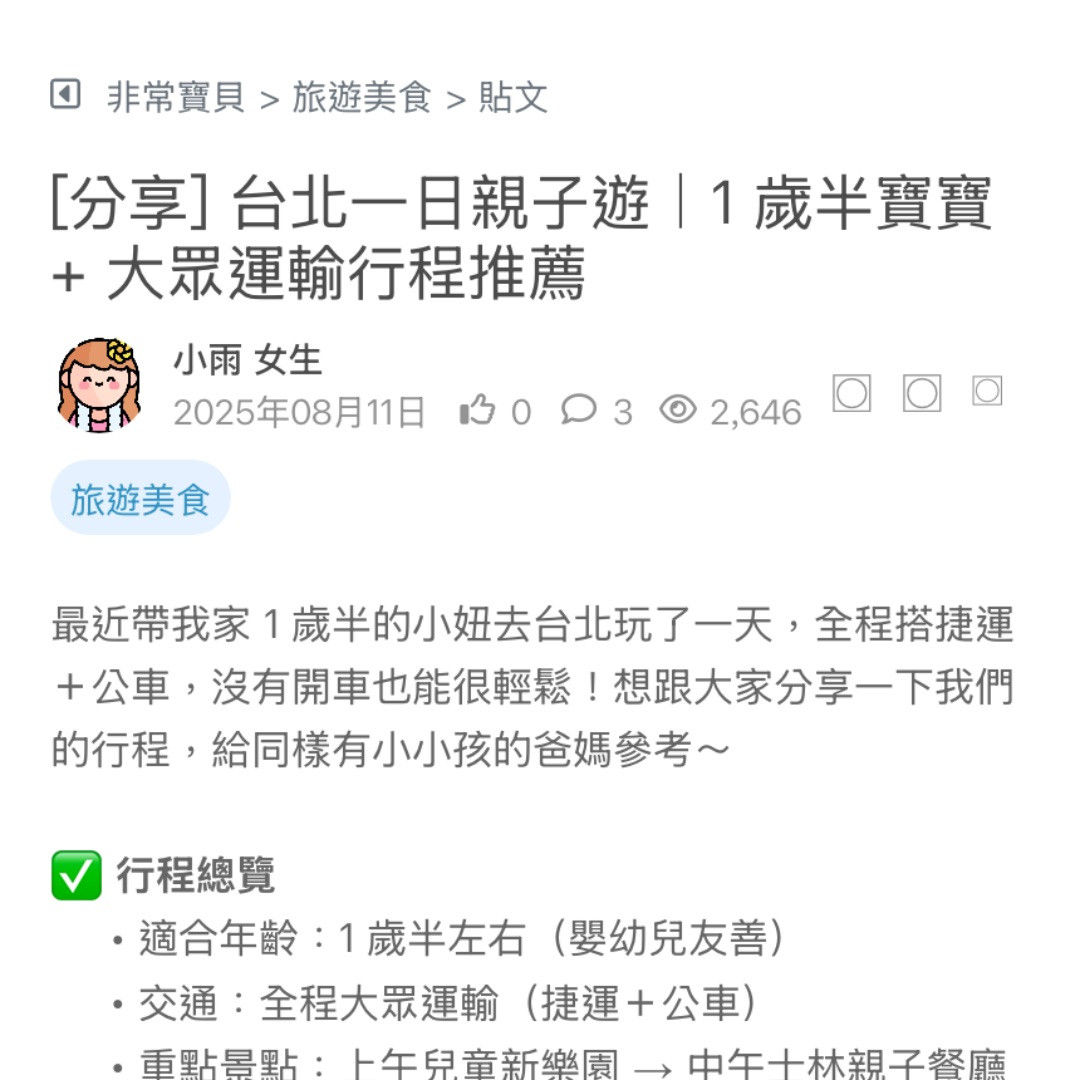 最近帶我家 1 歲半的小妞去台北玩了一天,全程搭捷運+公車,沒有開車也能很輕鬆!想跟大家分享一下我們的行程,給同樣有小小孩的爸媽參考~