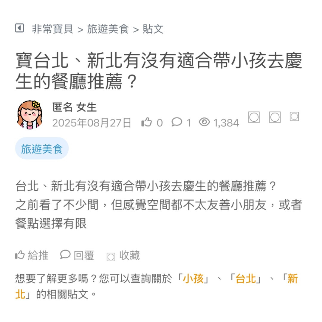 請問台北、新北、桃園有沒有親子友善的餐廳可以推薦我們去的呢~謝謝 看更多