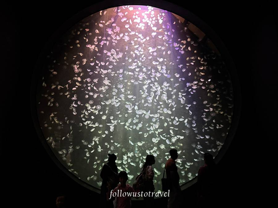 必拍水母牆繽紛又夢幻:超大水缸裡漂浮著月亮水母,呈現出夢幻場景。