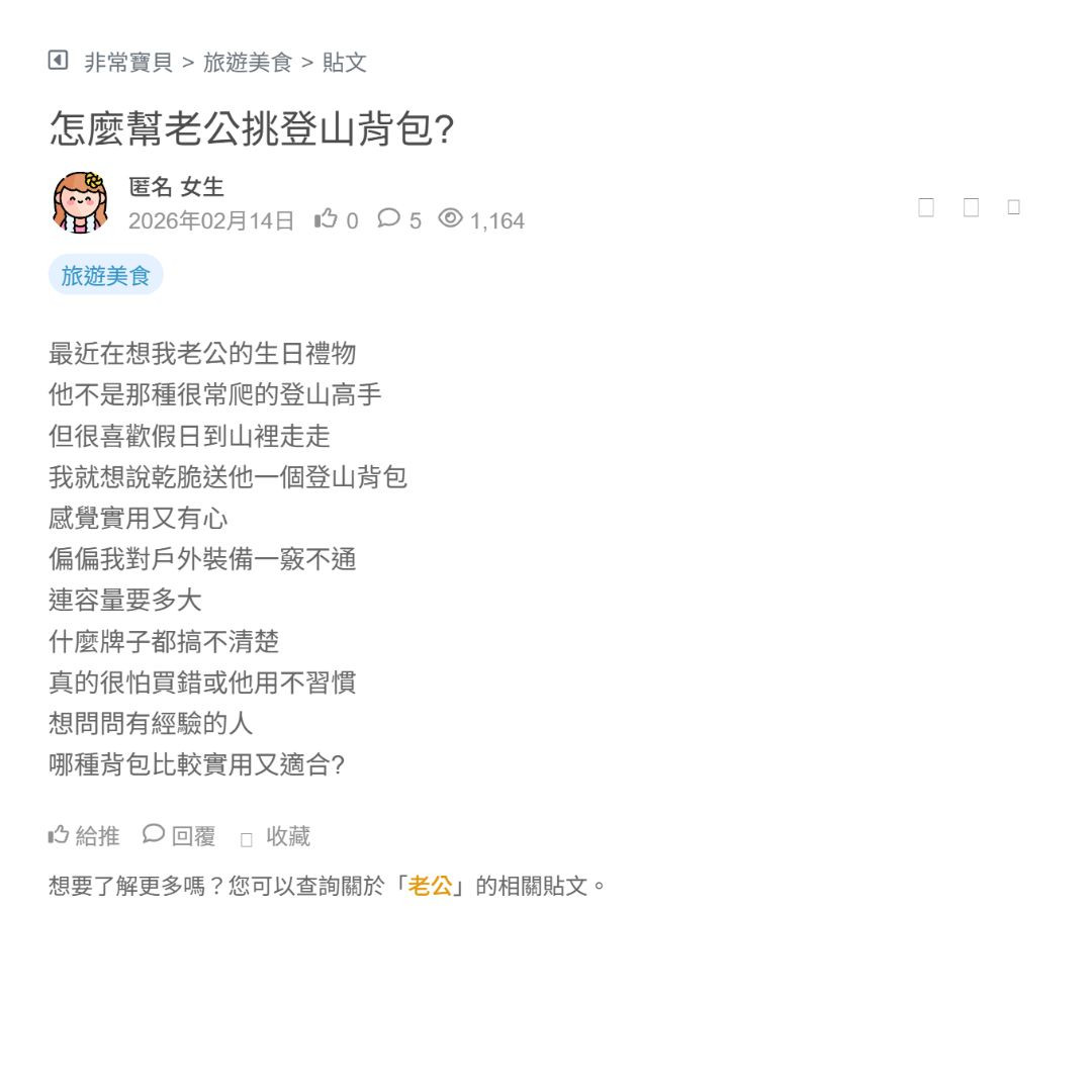 今年開始對登山非常有興趣 覺得走進山裡看風景 是最放鬆 最能擺脫工作壓力的方式 不過我剛入門 很多裝備還不太懂 尤其是背包 該怎麼知道適不適合自己 有沒有登山前輩 能分享一下登山背包挑選的建議? 謝謝 看更多