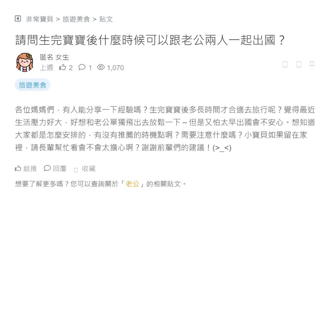請問生完寶寶後什麼時候可以跟老公兩人一起出國?