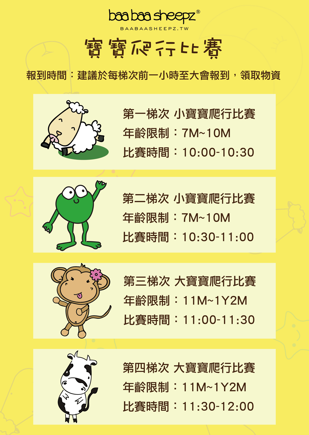 - 報名網址提供線上報名,適合約8個月至1歲3個月寶寶參加爬行賽,及1歲4個月至2歲寶寶參加萌寶搬搬樂。