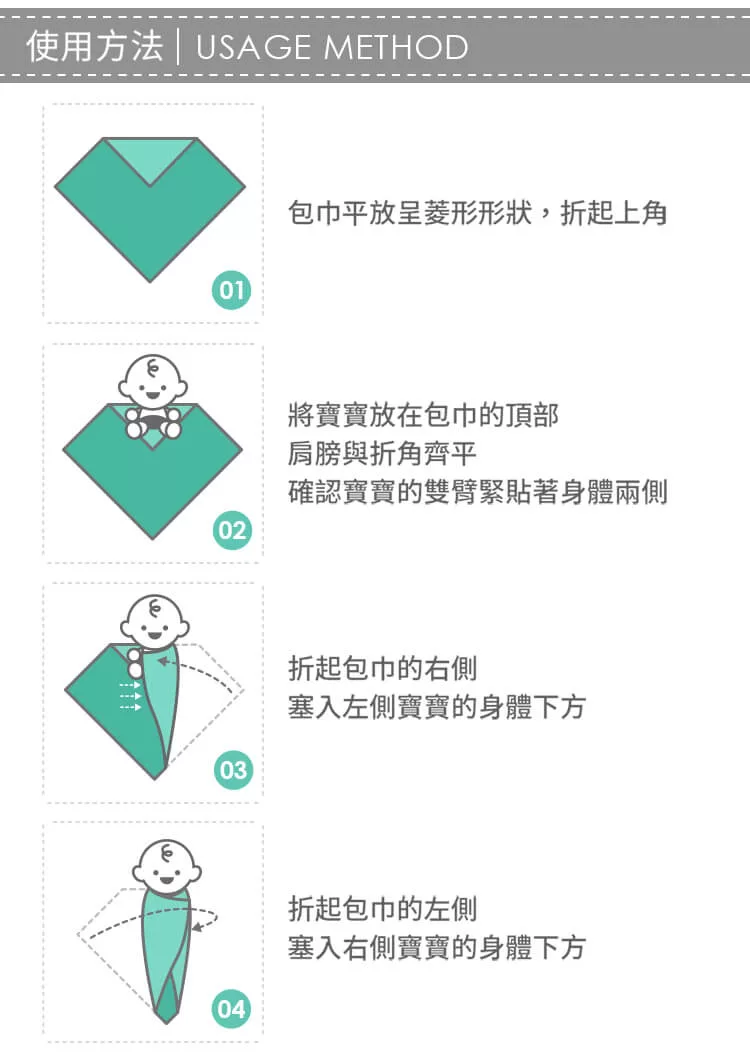 此摺法能讓寶寶包裹得緊實且不易滑動,適合新生兒使用。