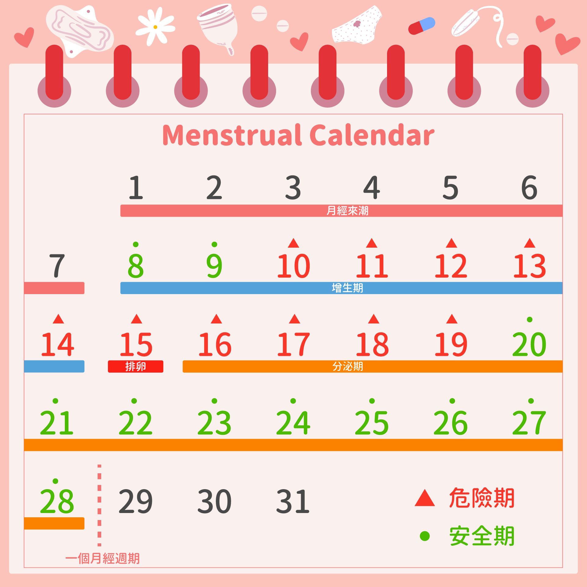 安全期:指的是月經週期中不易受孕的時間,通常是排卵期前後的危險期以外的日子。安全期避孕法基於避開危險期來降低懷孕風險,但因排卵日可能因個人體質或其他因素而有所變動,安全期避孕的準確度較低,尤其月經不規則者更難準確計算。