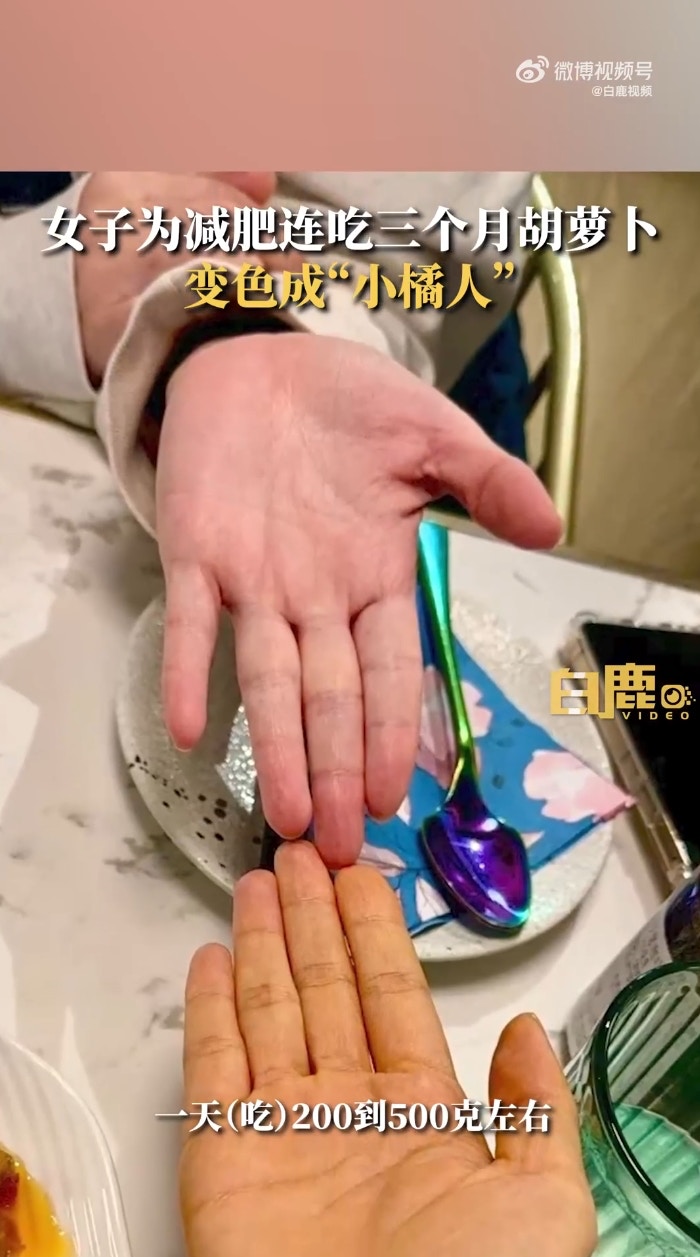 - 一般認為每日攝取超過約270克的紅蘿蔔(或等量含β-胡蘿蔔素的食物)才可能導致此現象。