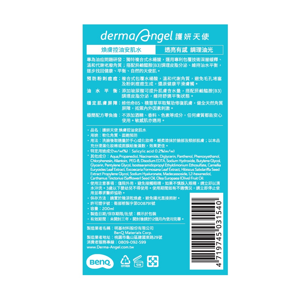 護妍天使煥膚控油安肌水是一款專為油痘肌設計的控油與煥膚產品,主要成分與功效如下:
