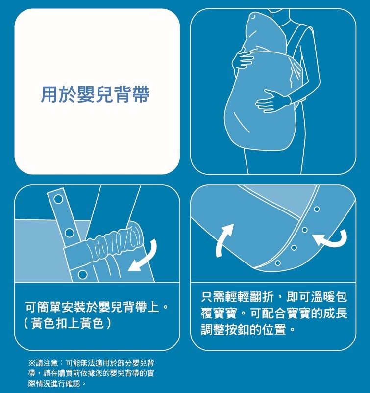 - 寒冷天氣時,應讓寶寶穿得溫暖,但避免穿著過厚衣物直接放入揹帶,防止影響揹帶的固定與安全。