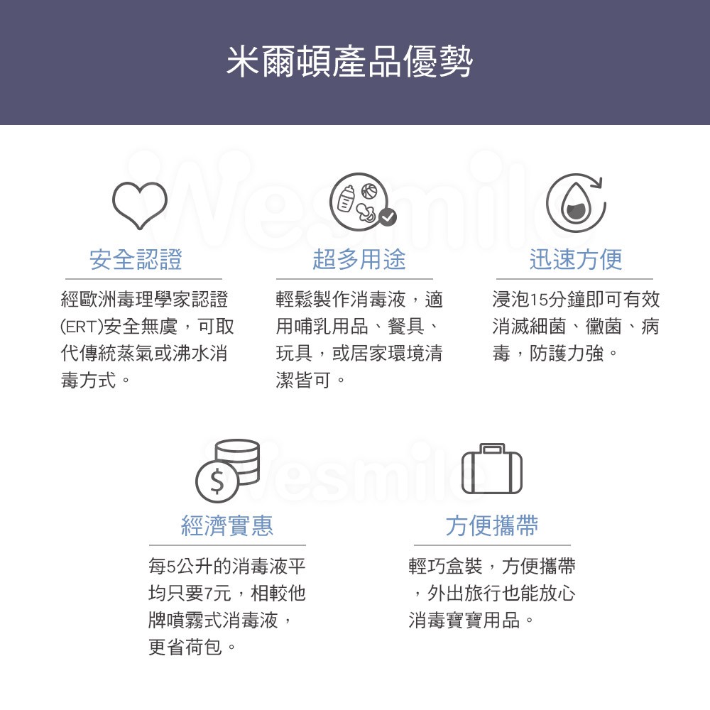 米爾頓消毒錠因為是固態,保存期限長且穩定,使用時才加水製成新鮮次氯酸消毒液,既環保又經濟,且安全性高,適合嬰幼兒用品消毒,深受英國及其他地區家長推薦。