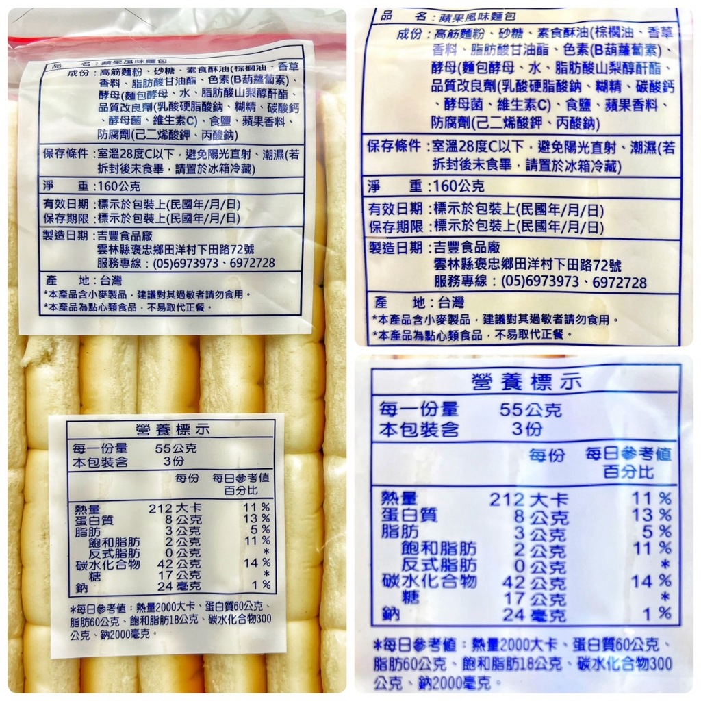 - 蘋果麵包含有全麥及水果成分,提供膳食纖維和部分維生素,有助於哺乳期媽媽的能量補充及腸胃健康。