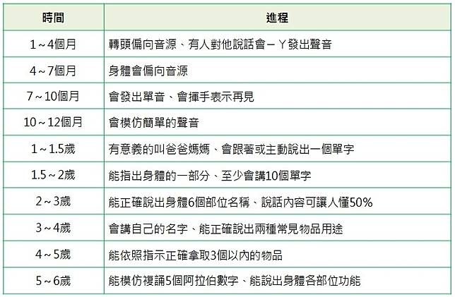 - 寶寶在20至24個月大時,若語言表達能力明顯不足,例如不會說簡單詞語或句子,且語言理解、認知、互動發展正常,但口語表達有三項以上未達標準,建議儘早尋求語言治療師評估。