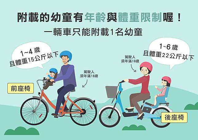 - 附載幼童會改變自行車重心,騎乘者需具備足夠體力與騎乘技術,並能判斷路況以確保安全。
