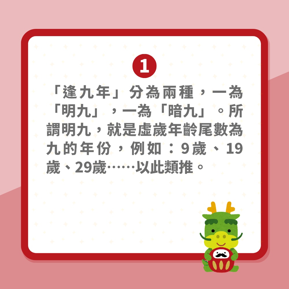 - 明九:指虛歲年齡尾數帶有「9」的年份,例如9歲、19歲、29歲、39歲等。