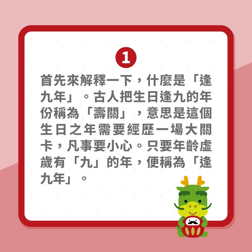 - 逢九年指的是虛歲年齡中帶有「9」的年份,民俗上認為這些年容易遇到運勢波動或挑戰。