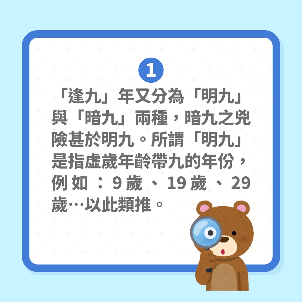 - 暗九:虛歲為9的倍數,如9歲、18歲、27歲、36歲等,暗九被認為比明九更凶險。