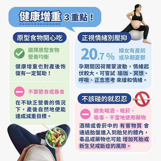 孕婦體重增加的重要性:根據國健署建議,孕期體重應增加約10至14公斤,這是支持胎兒健康成長的基本需求。即使孕前體重過重,也不應刻意減重,而是應該透過均衡飲食和適當運動來控制體重,避免節食造成不良影響。