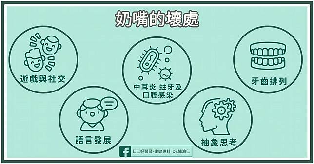 - 奶嘴長期使用可能因阻礙口腔運動和語音練習,間接影響語言發展和咬合功能。