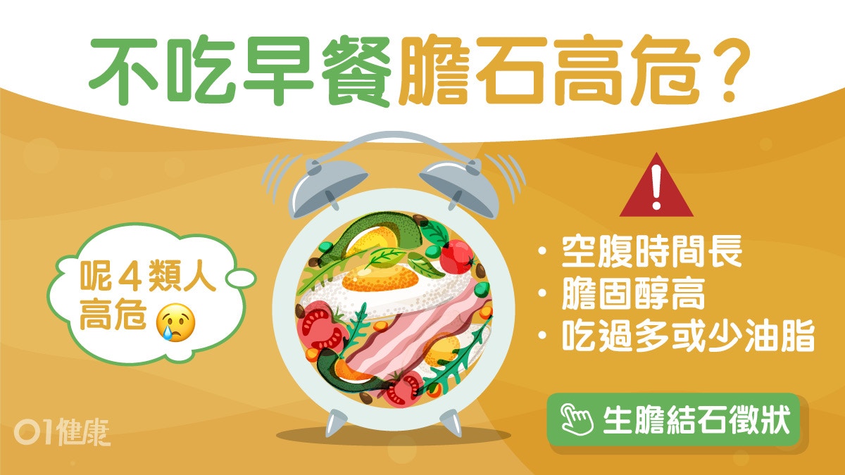 高危險群與其他因素:除了不吃早餐,愛吃高脂肪、高膽固醇食物(如魚卵、肥肉、動物內臟)、肥胖、中年女性、消化功能較差的老年人等也是膽結石的高危險群。