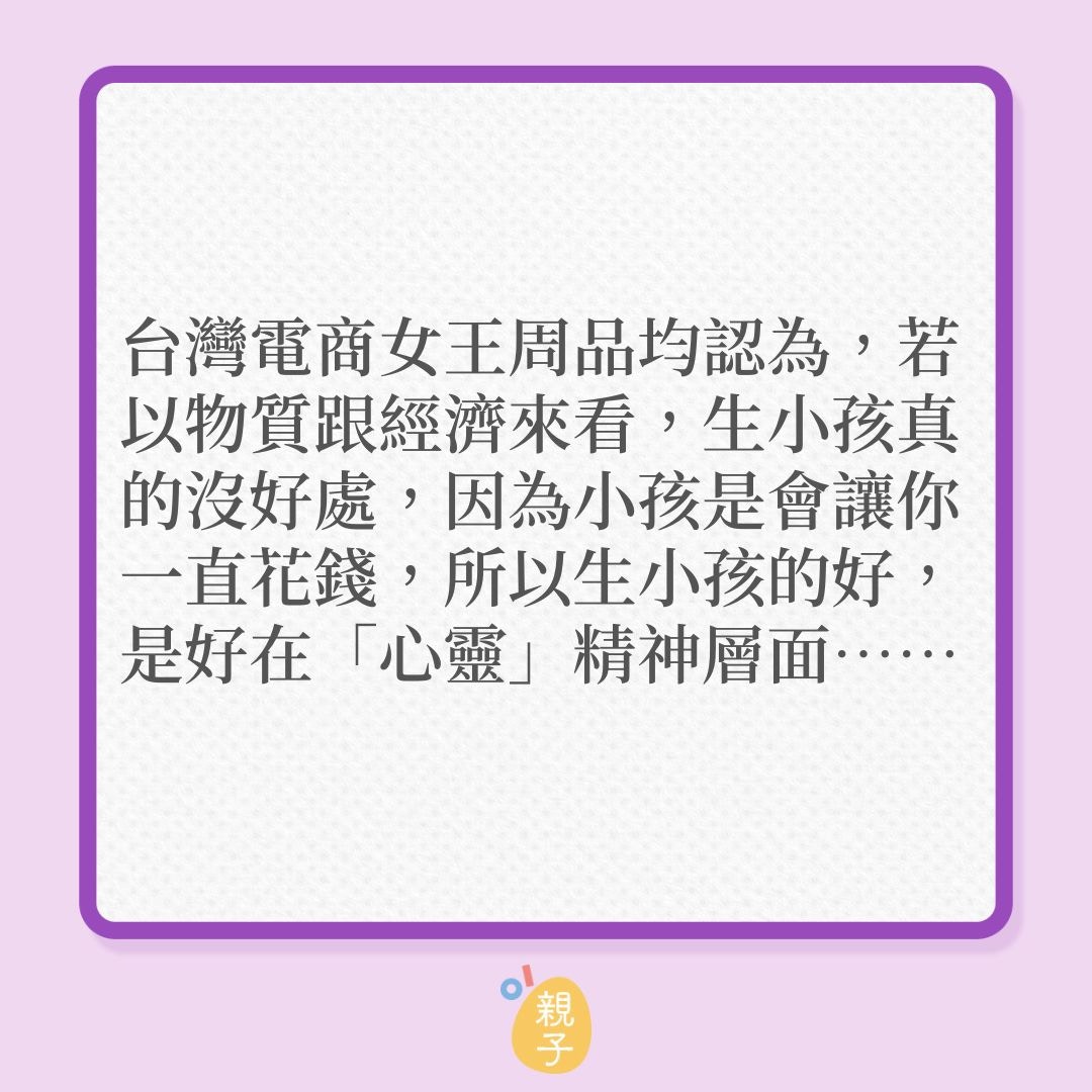 人生體驗的豐富與轉變:有了孩子後,生活不再只是兩人的自由生活,而是多了一個承載自己DNA的生命,帶來全新的家庭互動與責任感,這是無法從其他生活階段體驗到的獨特經歷。