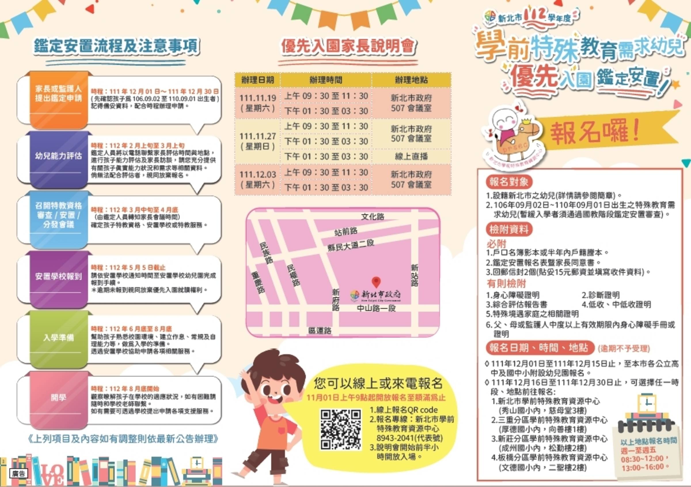 - 持有暫緩入學證明的幼兒不得參加優先入園及一般入園作業,需依規定時程辦理入學登記。