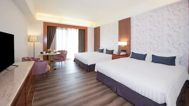房間空間:每間客房約15坪(約49.5至50平方公尺),空間寬敞舒適,適合家庭或多人入住。房型包括雙人房與四人房,床型有一大床、兩大床或四小床可選擇,部分房型設有獨立陽台,帶來良好採光與通風。