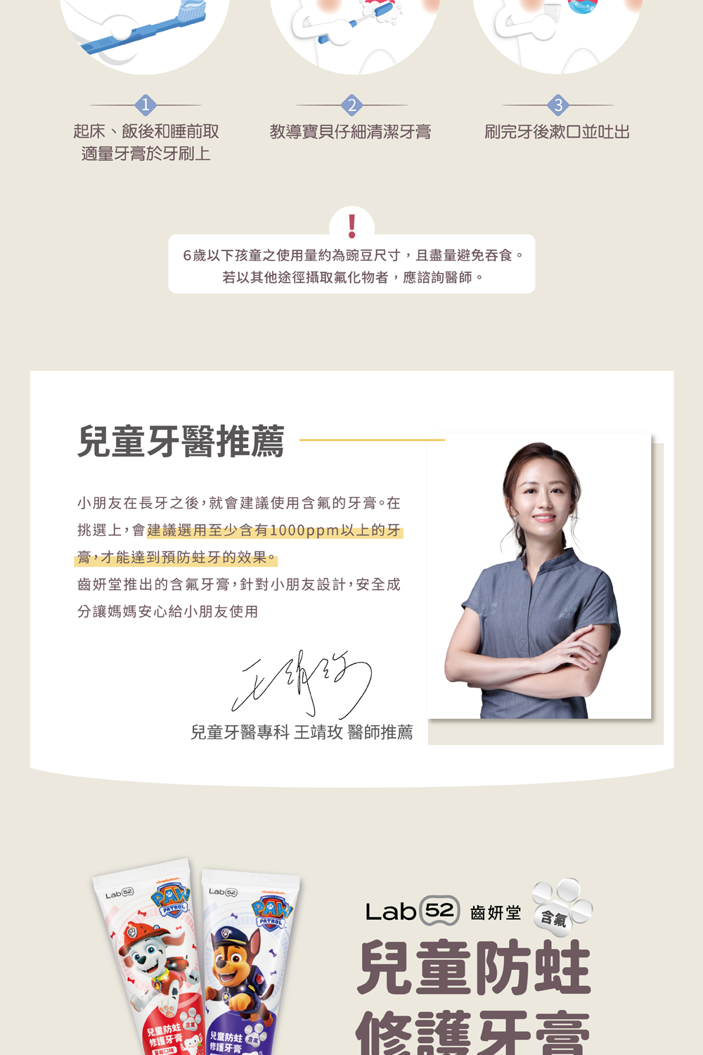 適合年齡:齒妍堂的兒童含氟牙膏主要是為兒童設計,特別適合會漱口後開始使用的孩童。根據世界衛生組織及台灣兒牙學會的建議,含氟量在1000-1500 ppm的牙膏適合6歲以上兒童使用,6歲以上的兒童甚至可以使用成人含氟牙膏。齒妍堂兒童牙膏含氟量約1200 ppm,符合此標準,適合6歲以上兒童使用;若是較小的兒童,則建議在會漱口後開始使用,並注意使用量及監督刷牙。