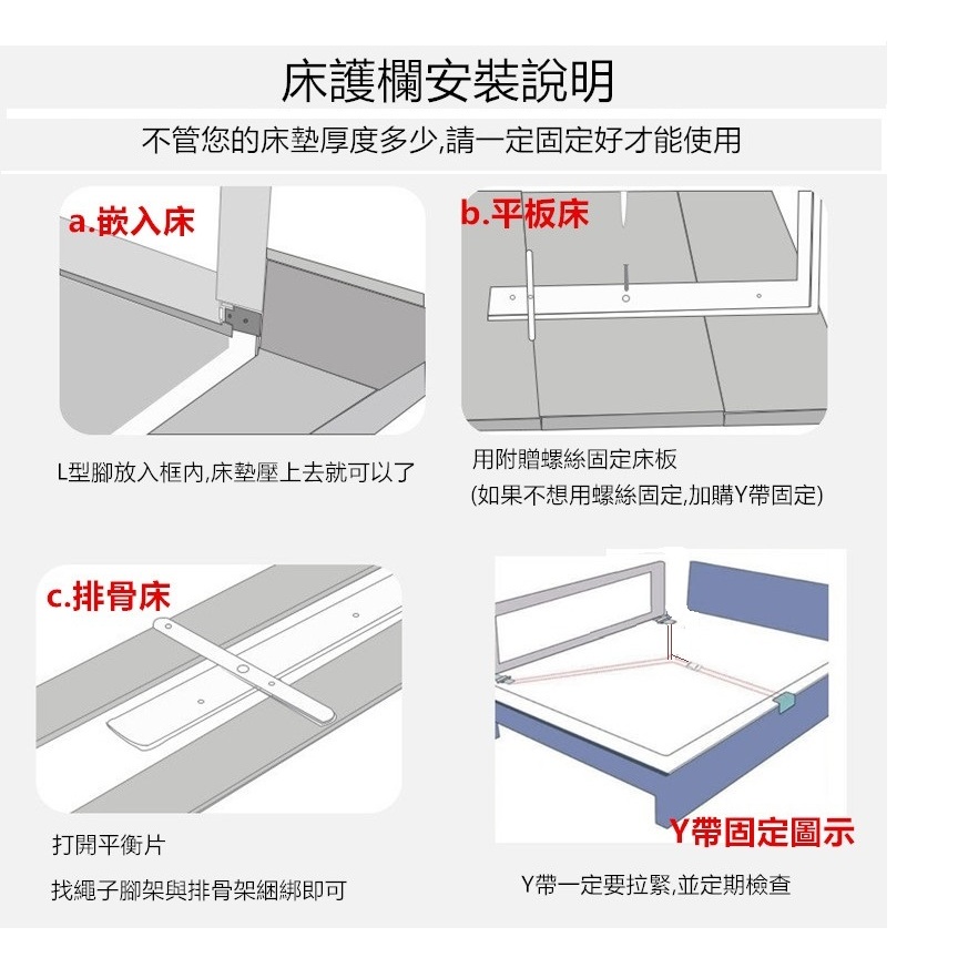 安裝與使用注意:護欄尺寸必須與床鋪吻合,避免護欄與床墊間出現縫隙,防止寶寶陷入縫隙中造成危險。此外,18個月以下的嬰兒使用成人床護欄需謹慎,且不建議讓寶寶單獨留在床上,即使有護欄也應有成人陪伴。