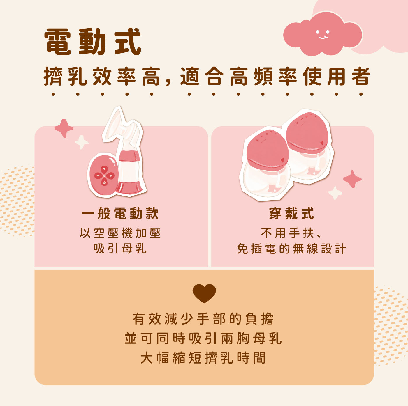 - 可搭配手擠乳使用,避免乳汁集中在乳暈前面。