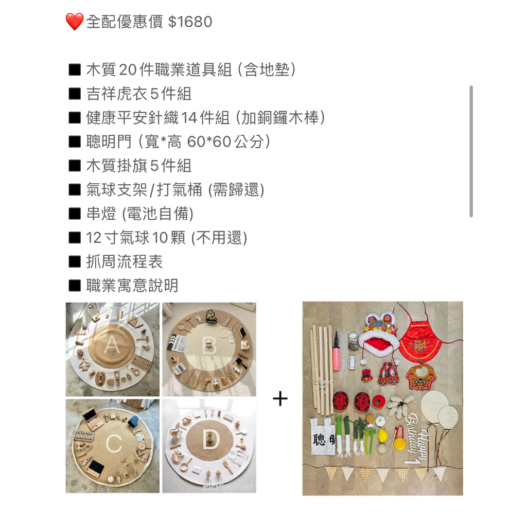 | 兒山抓周道具全套 | NT$3200(含訂金NT$500) | NT$3000 | 三天 | 宅配去程NT$200 / 回程NT$200 | 道具內容可更換,事前通知 |