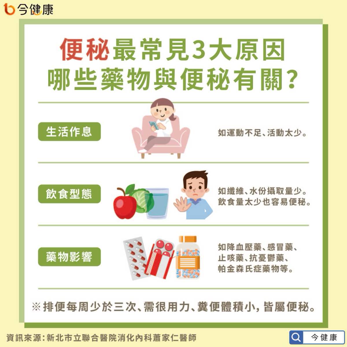 - 飲食纖維攝取不足、水分攝取不足、運動量不足。