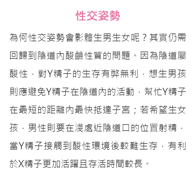 - 生女孩:男性射精在較淺處,可能採側臥位或伸長位,讓Y精子較快接觸酸性環境而減少存活。