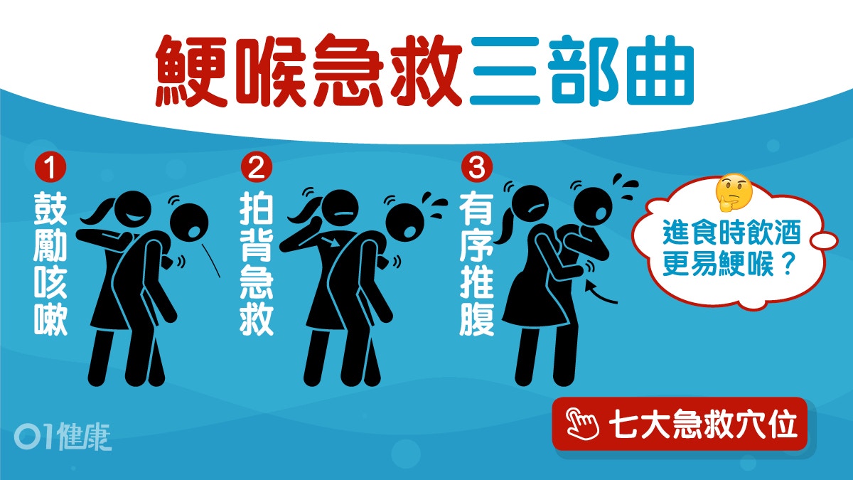 急救方面,若異物卡喉,且患者尚有意識,可嘗試哈姆立克法或擊背法幫助排出異物,但切忌用手指挖喉嚨,以免將異物推得更深或造成傷害。