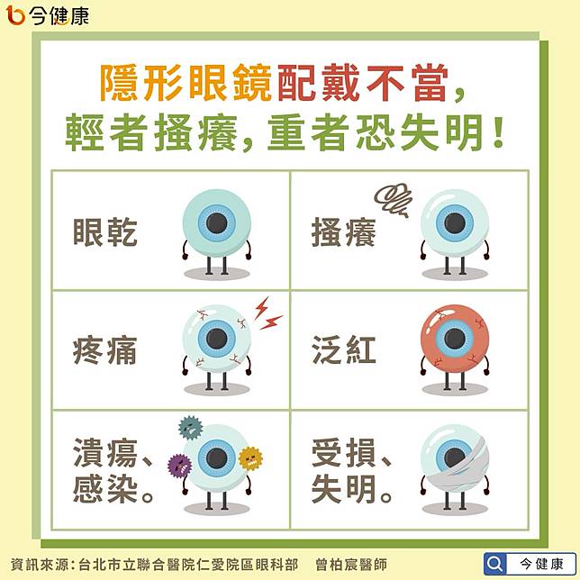 隱形眼鏡配戴超過8小時,容易導致眼睛缺氧、紅腫、乾澀,嚴重時可能引發角膜破皮、發炎,甚至潰瘍與感染。 - 戴著隱形眼鏡睡覺