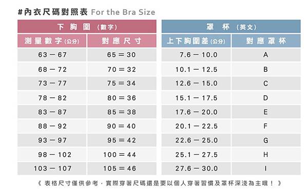 - 例如下胸圍63~67cm對應30/65尺寸,罩杯差7.6~10cm為A罩杯,依此類推。