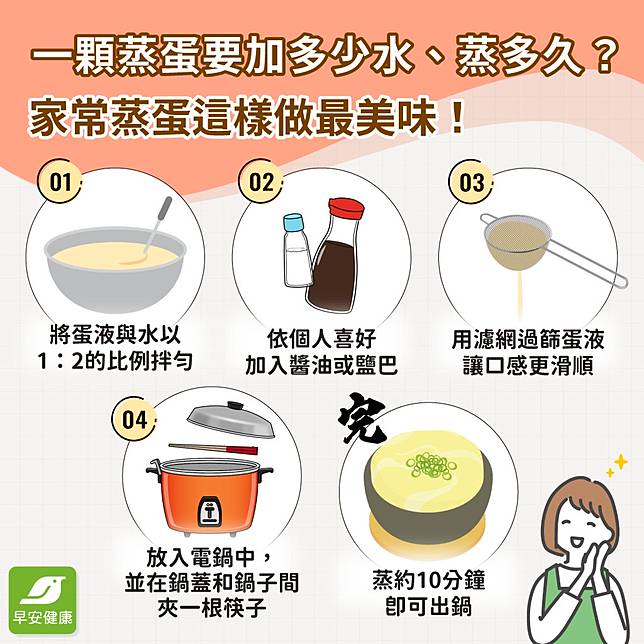- 蒸蛋容器最好選用耐熱且深度適中的碗,避免蛋液溢出。
