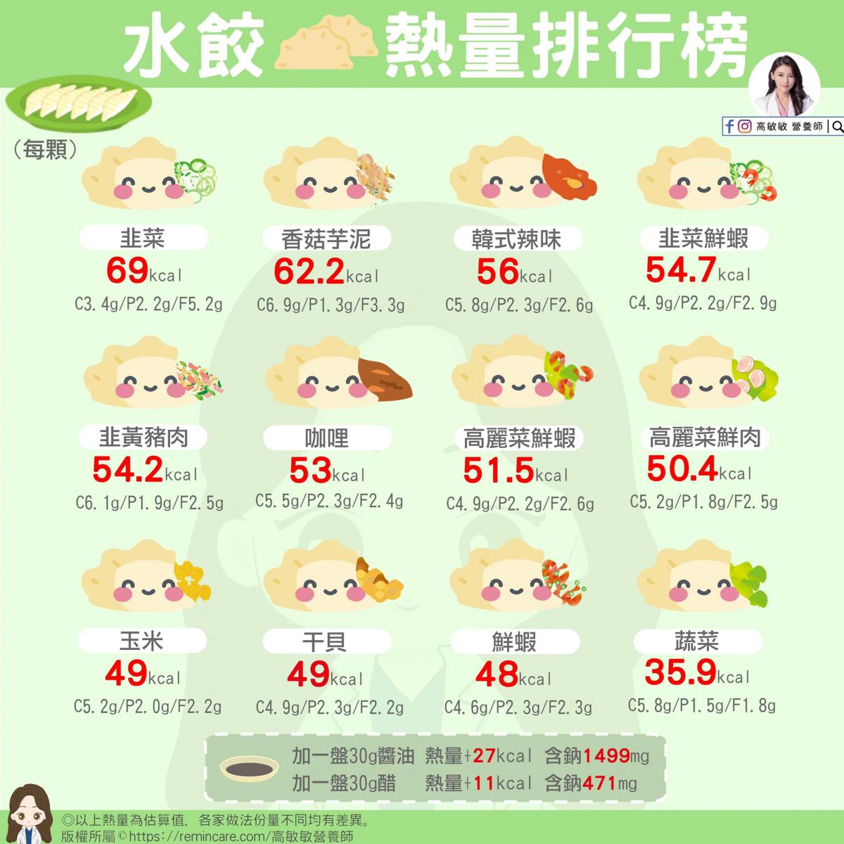 - 熱量最高的口味依序為:韭菜(約69大卡/顆)、香菇芋泥、韓式辣味、韭菜鮮蝦、韭黃豬肉、咖哩等,韭菜口味一顆熱量甚至相當於一碗飯的熱量。