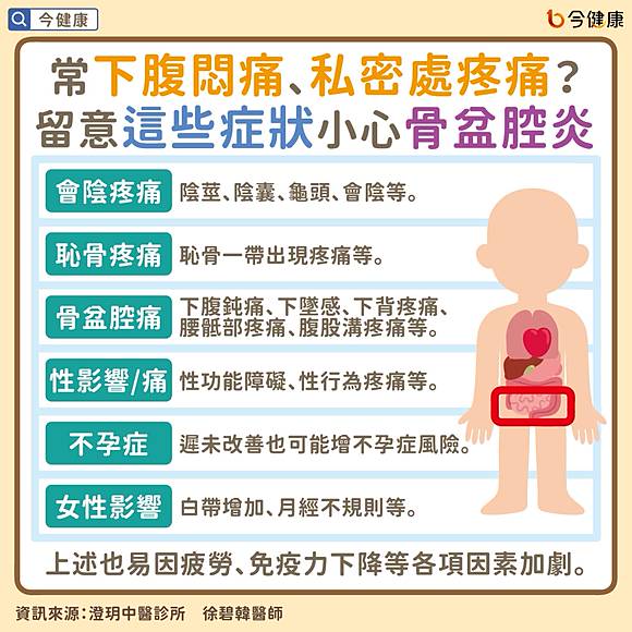 - 私密處疼痛多與陰道或尿道感染相關,疼痛較表淺且伴隨排尿不適。