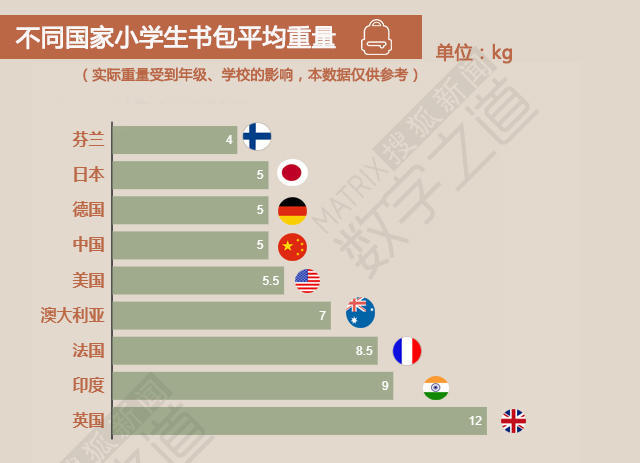 書包重量普遍超標:北市國小學生書包平均重量隨年級增加而加重,低年級約3.48公斤,中年級4.56公斤,高年級達5.38公斤,但實際上有學生書包重量甚至高達9.2公斤(低年級)、14.3公斤(中年級)、11公斤(高年級),遠超過教育部建議的「書包重量不得超過體重的八分之一」的標準。