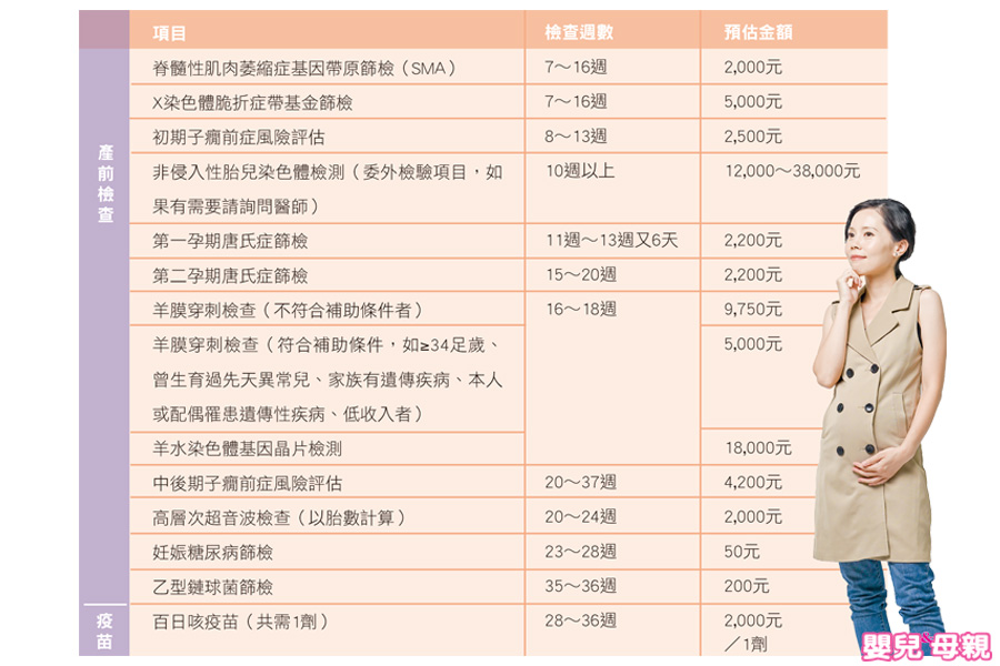 以上費用及時間安排為一般參考,實際價格及檢查內容可能因醫療院所不同而異。建議與產科醫師討論,依個人狀況安排合適的自費產檢項目與時間。