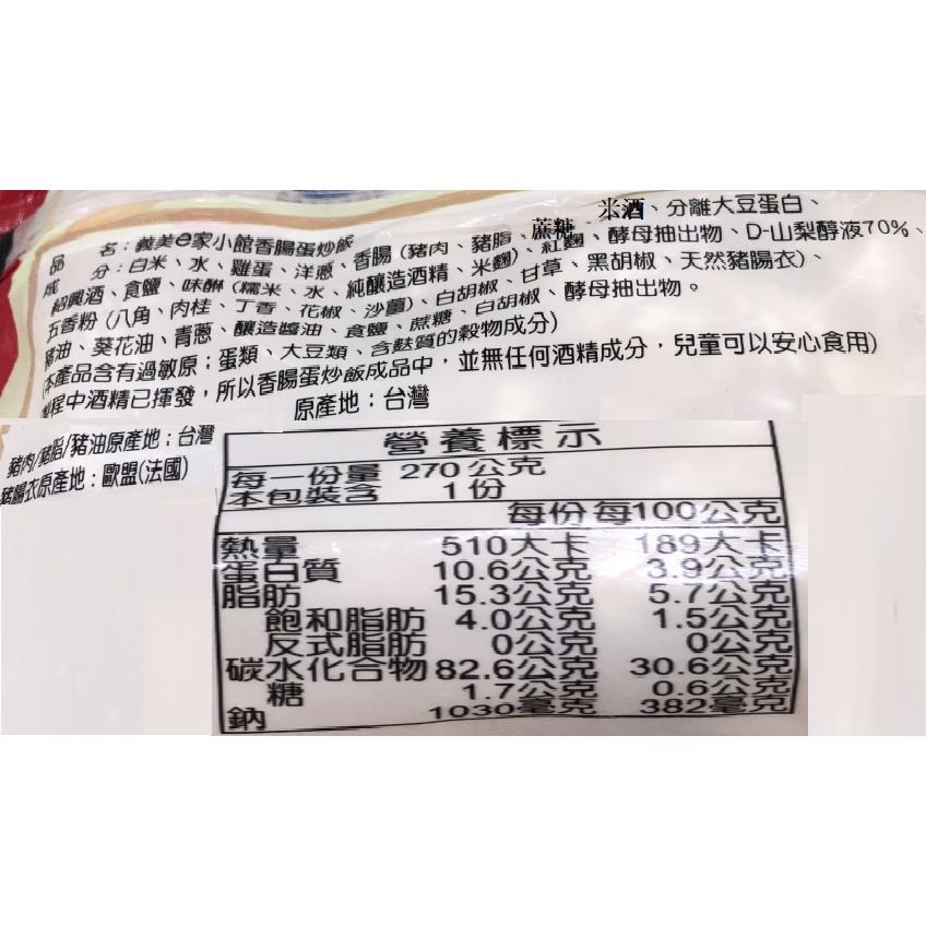 7-11香腸蛋炒飯的營養成分與熱量分布如下: