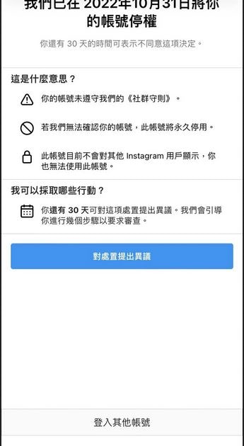 判斷帳號是否被停權通常會在App內收到通知,提示「因未遵守社群守則,帳號已停用」,並會給予申訴期限(如30天或180天)。若無法申訴成功,帳號及資料將被永久刪除。