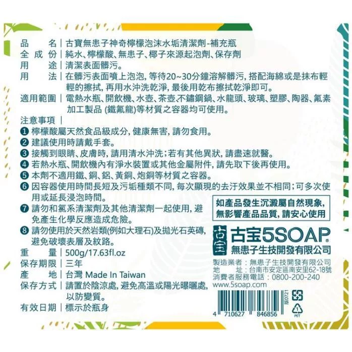 所以,無患子植物成分在水垢清潔劑中主要提供天然植物性泡沫,配合檸檬酸,能有效且安全地去除水垢,適合追求環保和低刺激性的清潔需求。