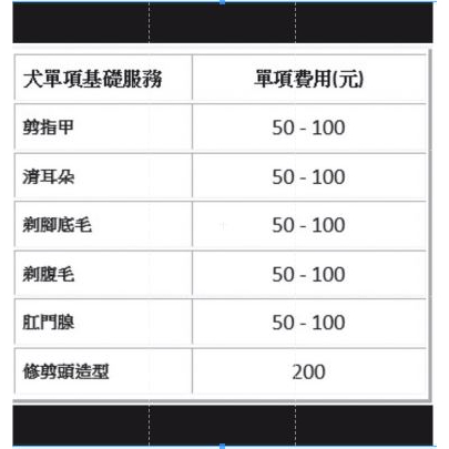 | 太平區某店(來源) | 洗澡、美容(剪毛、剪指甲)、住宿、安親 | 狗狗5公斤以下:洗澡350起,洗+剪900起 6公斤以上:洗澡650起,洗+剪1400起 貓咪短毛洗澡600起,洗+剪1200起 | 可加購額外項目,服務時間週二至週日,週一公休 |