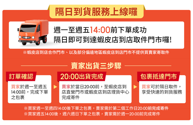 - 若訂單符合隔日到貨條件但未於預計配達日23:59前送達取件門市,蝦皮會提供優惠券作為補償(效期28天,每訂單限領一次)。