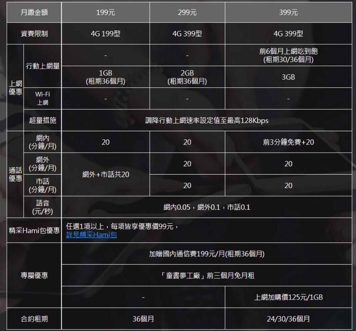 語音通話分鐘數:通常指的是行動電話之間的語音通話,包括網內(同一電信業者內)與網外(不同電信業者間)的通話。4G方案中,月租費越高,免費語音通話分鐘數越多,但網外通話分鐘數通常較少,且費率較高。
