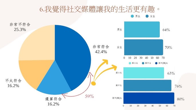 - 近六成學生認為社交媒體讓生活更有趣,並能找到興趣相同的朋友,女生平均每天花在社群媒體的時間比男生多約4.1%。